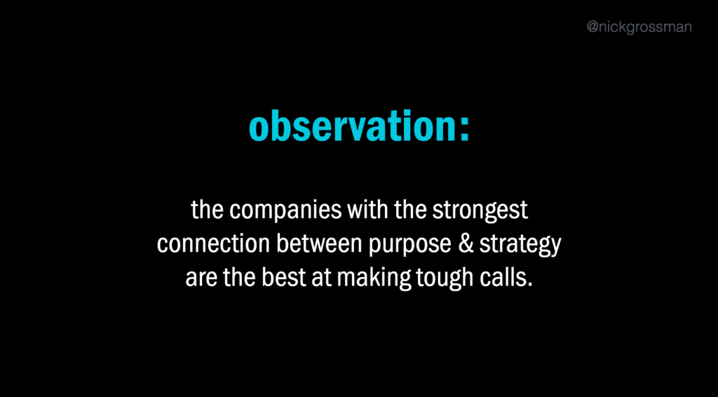 Last week, I was in Amsterdam at the Next Web conference, giving a talk about “Purpose, Mission and Strategy” — how companies can strengthen the connection between these to align efforts and make tough calls more easily (will post video when it comes online). From that talk: