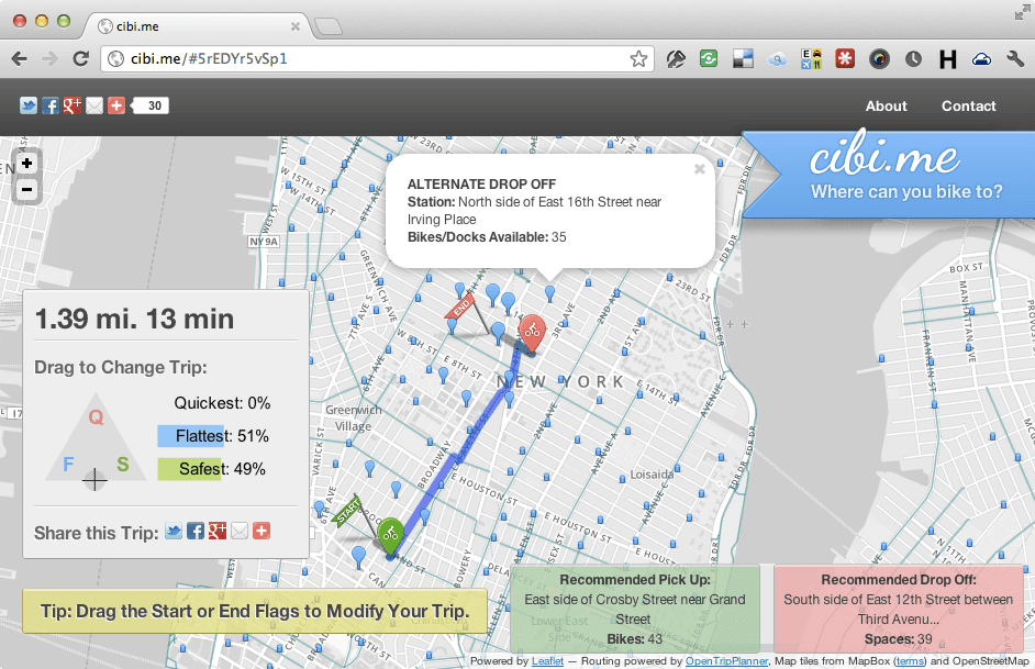 Second, it’s built on top of the OpenTripPlanner — OTP is an open source, multi-modal trip routing engine that OpenPlans has been working on for a number of years now; originally built for the new TriMet system map, it’s also been used in several other countries. Cibi.me represents one of the more creative ways to use OTP — as an API which the site talks to via JS. OTP lets you do awesome stuff like use the “bike triangle” to prioritize between safety, speed and flatness. (note that this feature was originally developed by David Emory for the Atlanta A-TRAIN mobility map)