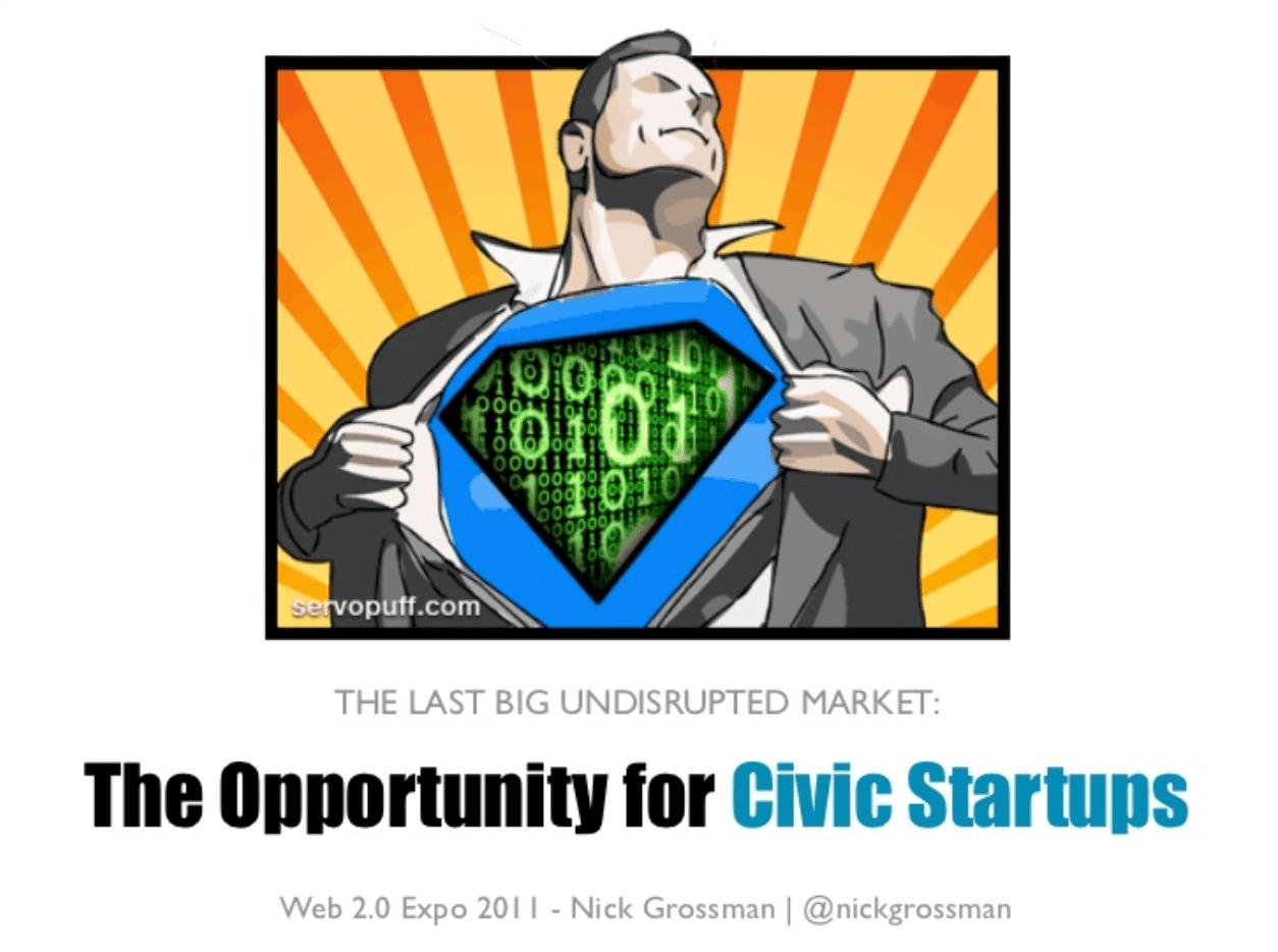 Last week at the Web 2.0 Expo, I gave a talk on The Opportunity for Civic Startups. I was filling in for Code for America‘s Jen Pahlka, and the presentation itself is an hybrid of a version I did at the t=0 Entrepreneurship Festival at MIT a few weeks ago, a version Jen did at Future of Web Apps earlier this year and a version that Andrew McLaughlin has been giving. Here are my slides.