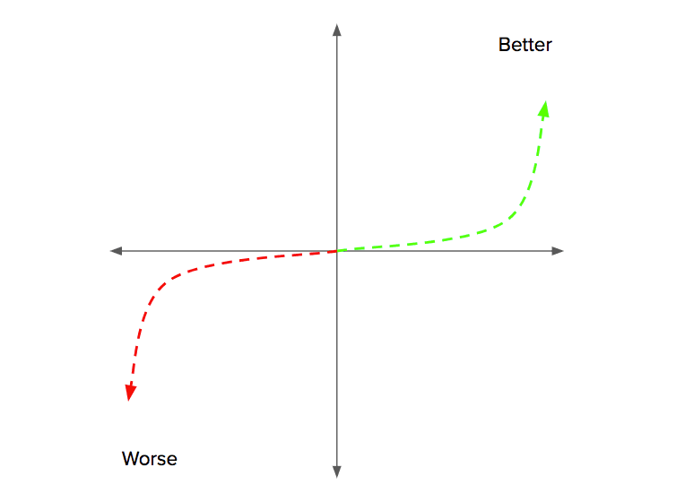 In other words, when things are good, they tend to get better. And when things get bad, they tend to get worse. This is a horrible paradox. (Reminds me a bit of The Pursuit of Happyness which illustrated this beautifully and painfully). I would argue that “health”, defined broadly, is about getting to the right side of the curve, where your efforts are not only making you net better, but they are contributing to potential exponential improvement thanks to compounding interest. And getting away from the left side of the graph, where every day, every moment, has the potentially of compounding the badness.