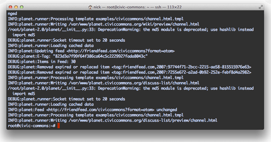 For instance, here’s the python script that powers the “latest activity” section of the civiccommons.org homepage: