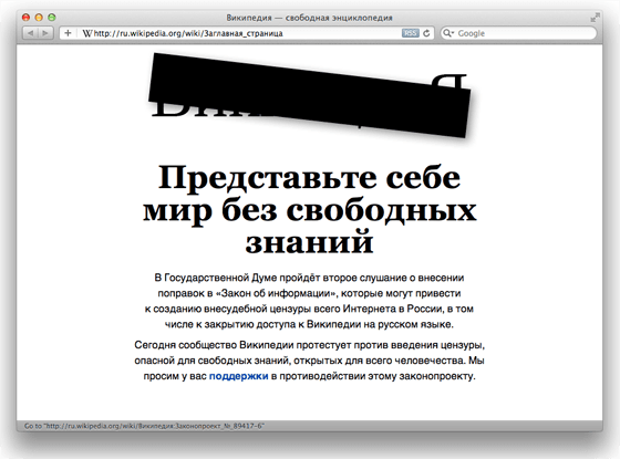 1) Wikipedia Russia is blacked out today, to protest legislation that would increase government control over the Internet.