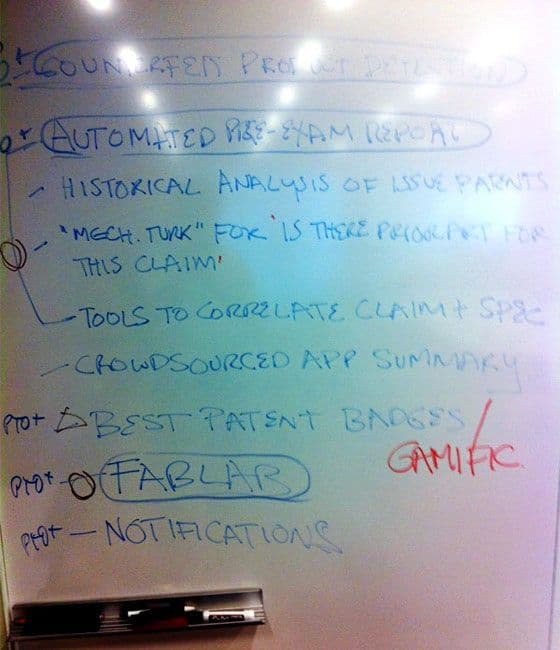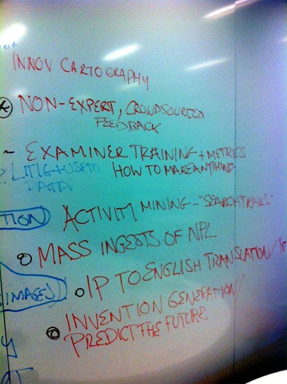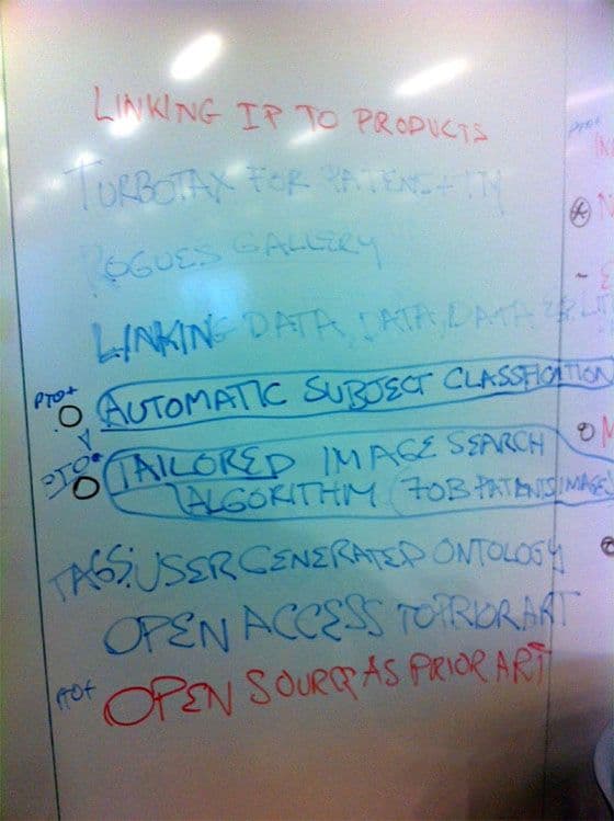 Last week at the Media Lab, we had the pleasure of hosting USPTO Director Dave Kappos and several members of the PTO’s senior staff, to brainstorm ways that we might use technology in creative ways to help the patent office work better, and to help the patent system work better in general. The meeting was organized by Beth Noveck, who is just beginning her stint as a visiting professor at Lab — among other things, Beth and her former student Chris Wong are the ones behind the Peer to Patent project, which crowdsources aspects of the patent review process. The goal of the day was to come away from the meeting with a handful of concrete projects that we (at the Media Lab, and at other institutions) could start to hack on.