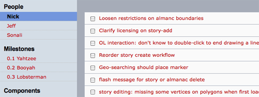 When I couldn’t sleep the other night, I started mocking up a zippy drag-n-drop front end for Trac, based on the snappy UI of tools like Things (working title is FasTrac). Then, bam! Bitten by a weird, seems-like-a-bug w/ jQuery UI drag and drop. It appears that droppables aren’t discoverable by draggables if the droppable has a fixed width. I have a hard time believing that’s true, yet here I am. I posted to the jQuery UI list, but haven’t heard back yet.