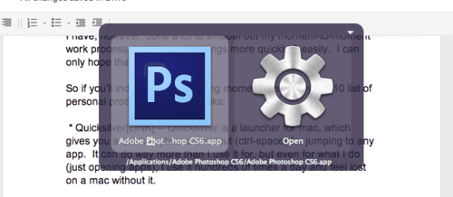 1) Quicksilver — Quicksilver is a launcher for mac, which gives you a quick keyboard shortcut for jumping to any app. For example, if I press control-space (to open quicksilver), and then press “p”, it prompts me to open photoshop. It’s also awesome at remembering your choices and learning from them, so it always presents the thing you want as the first option. It can do way more than I use it for, but even for what I do (just opening apps), I use it hundreds of times a day and feel lost on a mac without it.