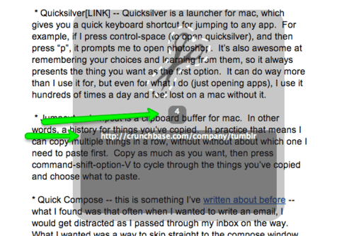 2) Jumpcut — Jumpcut is a clipboard buffer for mac. In other words, a history for things you’ve copied. In practice that means I can copy multiple things in a row, without without about which one I need to paste first. Copy as much as you want, then press command-shift-option-V to cycle through the things you’ve copied and choose what to paste: