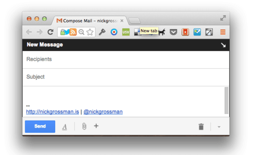 4) Chrome search shortcuts — One of the lesser known features of Chrome (and I believe firefox, and maybe safari too) is the ability to customize your search engines. Of course, this means setting a default for regular web searches (I use DuckDuckGo), but you can also set up more specialized keyword-based searches. For example, if I go to the chrome bar, and type in “t nickgrossman”, it will take me to http://twitter.com/nickgrossman — because I’ve set up a custom twitter shortcut with the letter t. I also have one for Crunchbase, which I use all the time — so I type “c tumblr” to get a quick link to the Tumblr Crunchbase page. And the one I use the most is the Gmail Search extension, which lets me go directly to searching my email by entering “gs <search-term>” in my address bar. Similar to Quick-Compose, this keeps me out of my inbox when I don’t need to be there. To customize your search queries in chrome, control-click (or right-click on PC) the address bar, and choose “Edit Search Engines…”