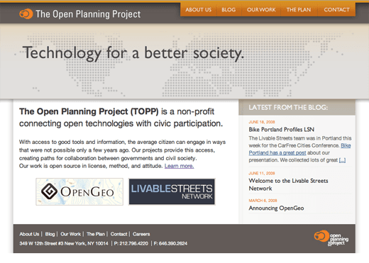 Over at The Open Planning Project, we’ve always had a bit of a hard time explaining what we do. That job just got a little bit easier, with the launch of the new-and-improved TOPP website last Friday. Reactions from within the staff have been remarkably similar: something along the lines of “Phew, now I can finally tell people what the heck it is we do here!’.
