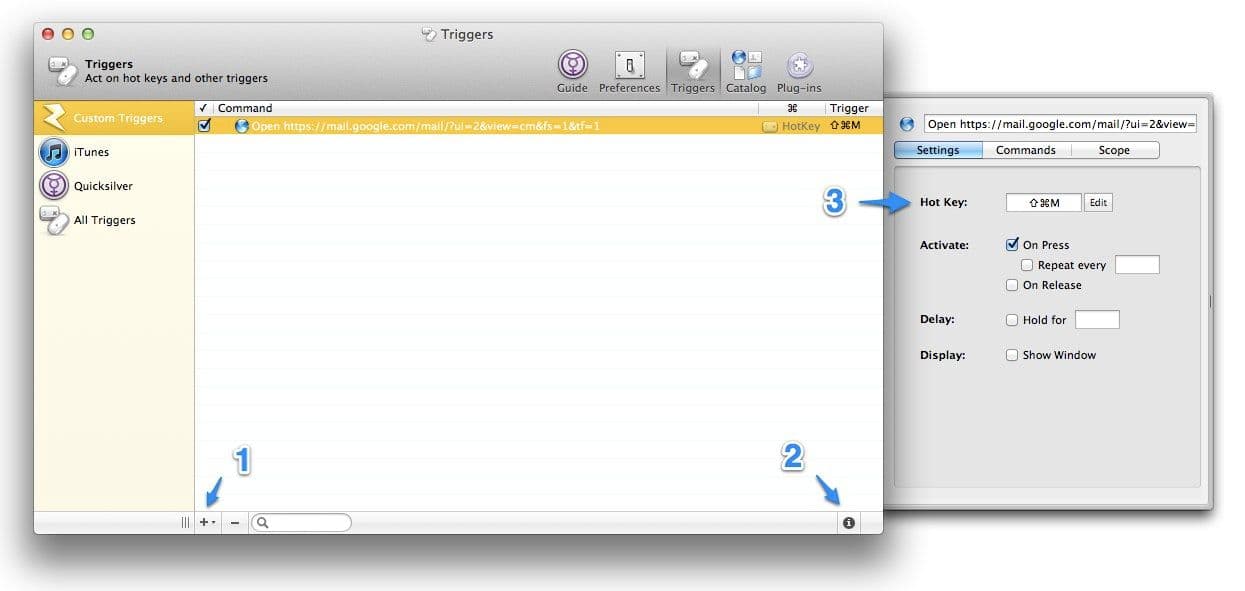 Go to the quicksilver preferences, then go to Triggers. Create a new “hot key” trigger, and paste “https://mail.google.com/mail/?ui=2&view=cm&fs=1&tf=1” into the prompt. Save, then press the “info” icon, and open up the trigger settings. Under “Settings”, enter a Hot Key. I use command-shift-M. When you’re done it should look like this: