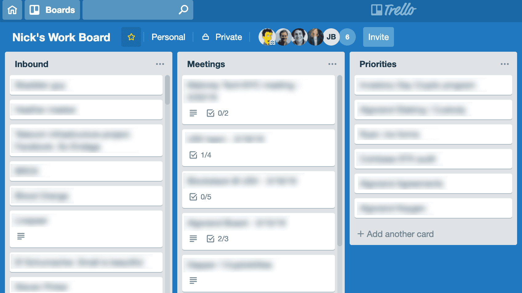 On the left is the “Inbound” list. I use this to capture fleeting thoughts, ideas and notes. Things get on this list in two ways: 1) via Wunderlist, which I mainly use by phone — I have found this to be the easiest and quickest way for me to jot something down on the go. I use Zapier to move things from my main list in Wunderlist into “inbound” on Trello. 2) I use Trello’s built-in email-to-board feature to get larger items out of my inbox and into Trello. Again, the goal here is just to capture so I can process/prioritize later.