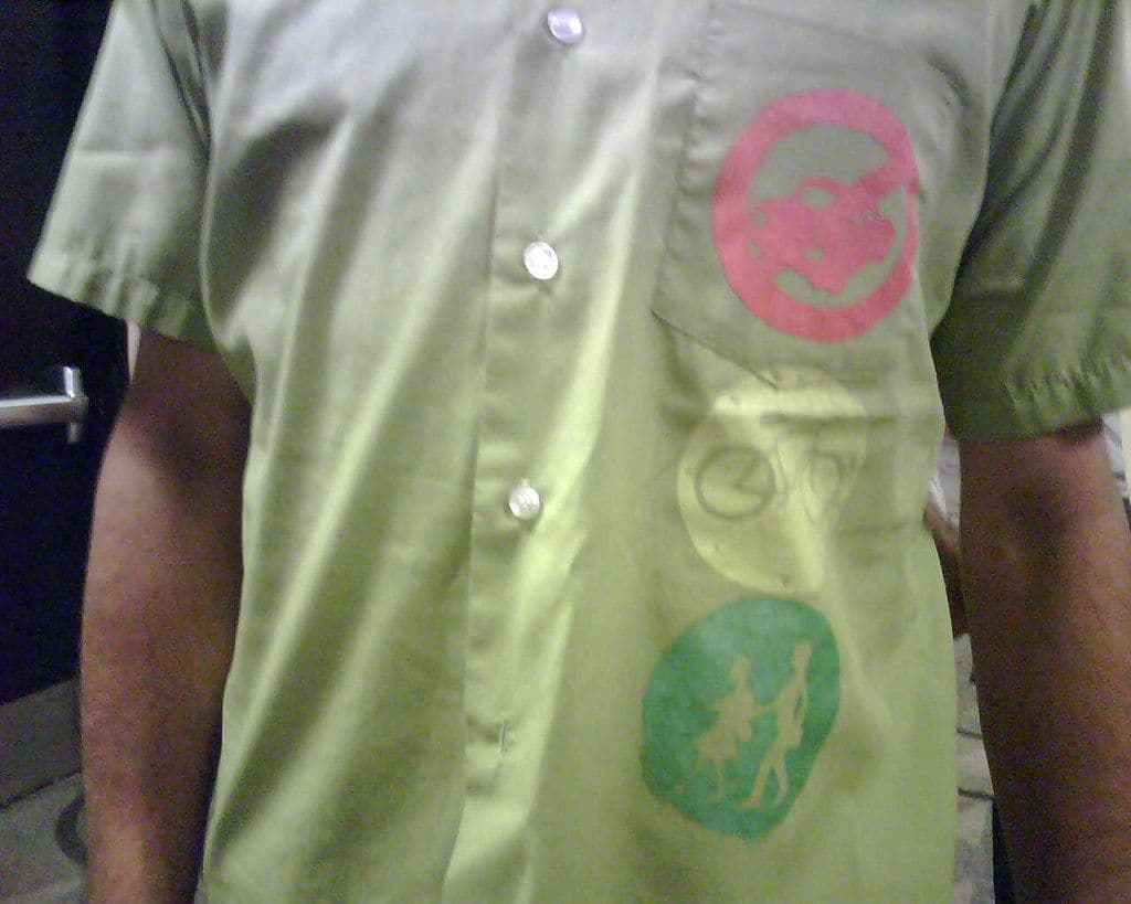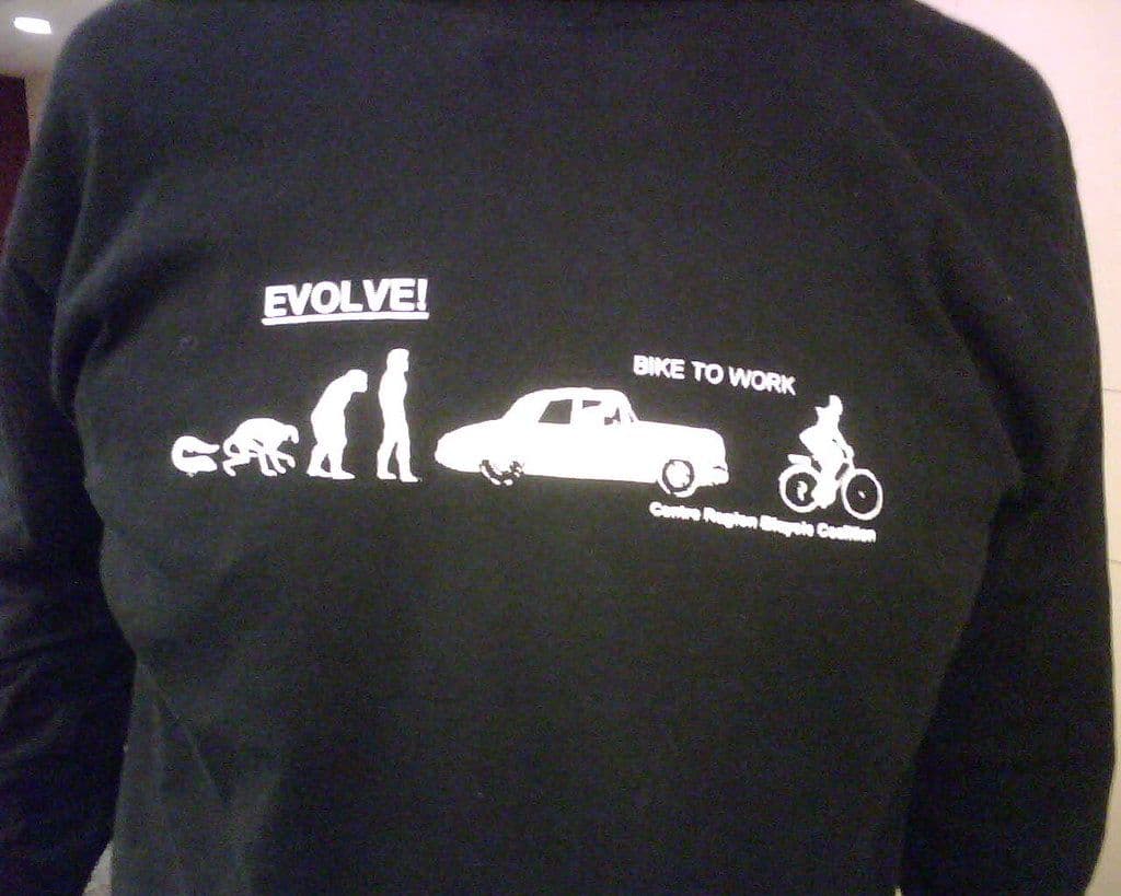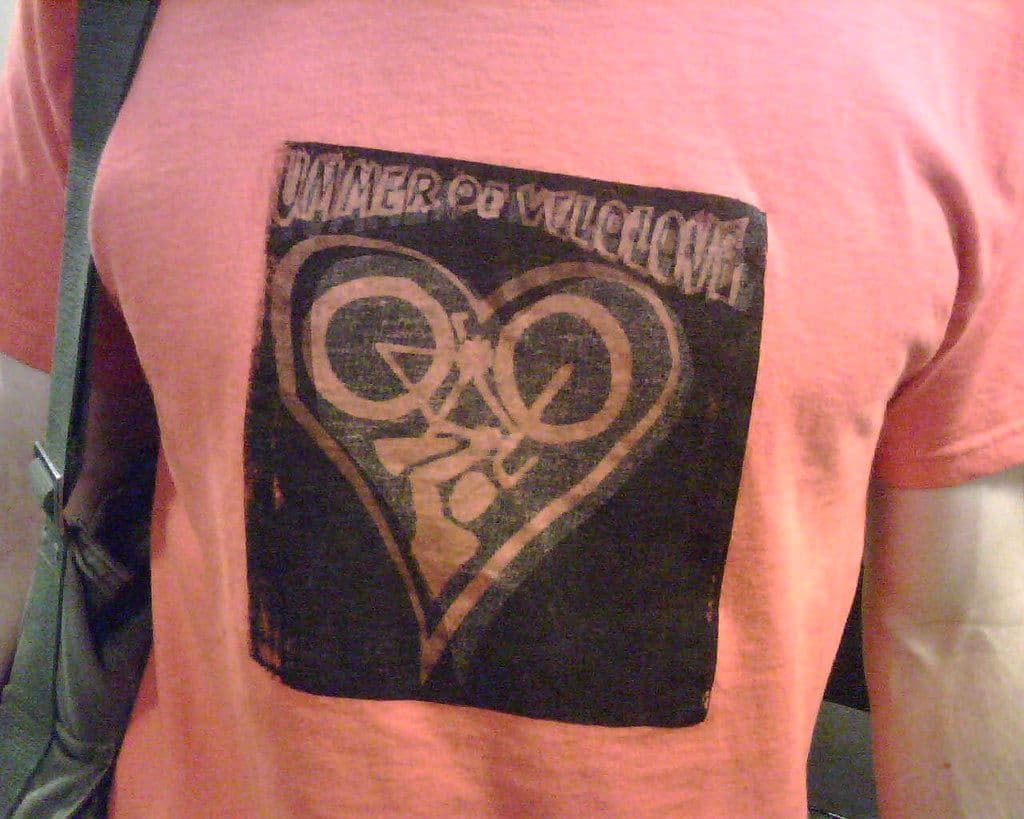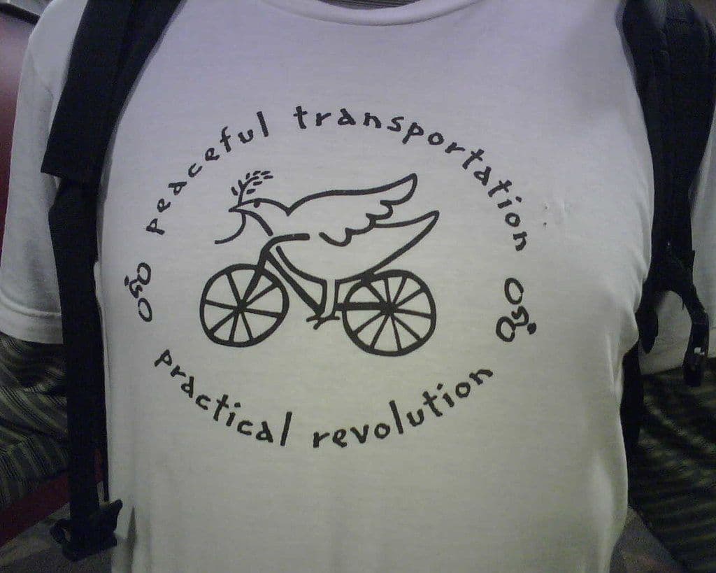 This shirt if from a car-free day in Toronto. The shirt reads: “no cars, bikes go with caution, people walk freely”.