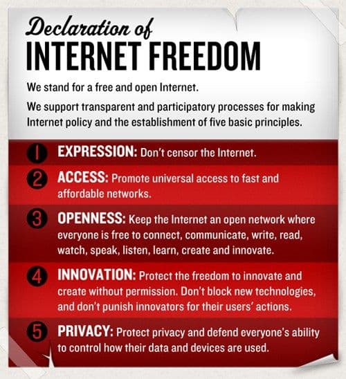 On the one hand it feels presumptuous and self-indulgent to speak about Interent freedom in the same breath as other independence and rights movements from our history. On the other hand, I believe that we are on the leading edge of one of the biggest global changes we’ve ever seen, and there are serious issues of freedom and control at stake. My friend Brad likes to say that the shift to the world of connected humanity and free information is bigger than the industrial revolution — rather, it’s more like the shift from hunter/gatherer to agrarian society in terms of the fundamental changes in how we understand how we relate to our good and to one another.