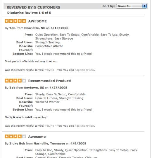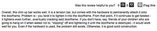 An example: In what will likely prove a fit of hopeless optimism, I’m going to buy a pull-up bar for our bedroom door. As it turns out, there are a lot of options — bars that screw in to walls, bars that use horizontal tension (like a curtain rod), and big multipurpose bars for pushups, situps, and pullups. I think I want the kind that doesn’t screw in, and I know I don’t want a big piece of equipment. So, the question is, which is the best one? Where to go but to the customer reviews. And finally, to my point.