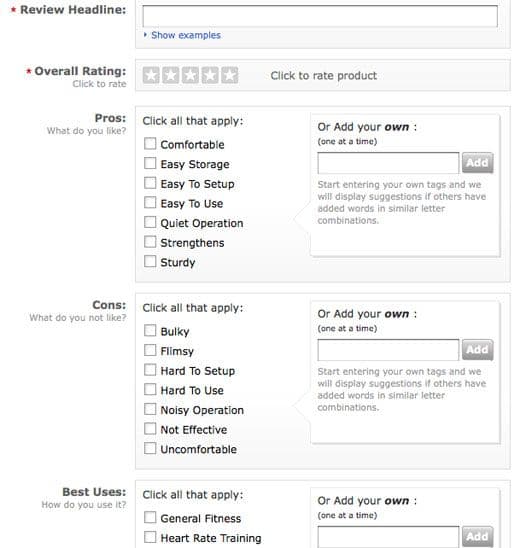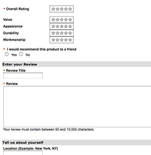 Looking at the overstock review form, you see a different story. Rather than pre-thinking for the reviewers, they ask for ratings on general quality and then a detailed description.