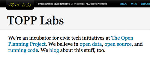 Since then, TOPP Labs has come a long way. We’ve re-imagined ourselves as an incubator for new enterprises and initiatives that make cities work better, and have taken off down several paths: information systems for public transit (under the OpenGeo Transit brand); tools to facilitate citizen engagement, such as FixCity and Community Almanac; and initiatives to help public agencies get on board with “open,” such as Open311, OpenMuni, and the NY Transit Data project. We’ve been busy connecting with the open government, open cities, and progressive planning communities, and have been documenting our progress on our blog, The Civic Hacker.