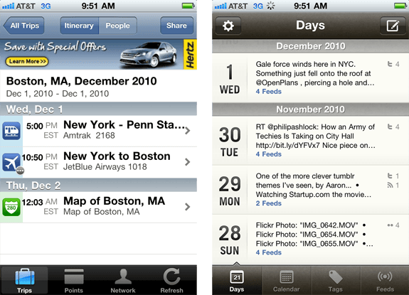 There are certainly neighboring precedents in this general area of tools that organize my web-based presence. Some of my favorites are TripIt (on the left, below) which takes my travel info and repackages it in a way that’s useful to me, and Momento (on the right), which takes a a bag of feeds and turns it into a nice timeline view: