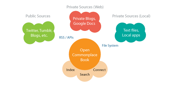 So, what I want is a tool that helps me review across all of these sources, brings them together in a nice way, makes searching easy, and allows for some amount of fuzziness and random discovery. Basically an “open” commonplace book that understands my distributed landscape of knowledge bits. A commonplace book that works like the web.
