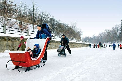 You see, in Ottawa during the wintertime, the city’s canals freeze over and they turn into temporary frozen streets. As you can see above, Ottawans turn to using them for their daily activities, like taking their kids to school. Imagine taking your kids to school on ice skates!