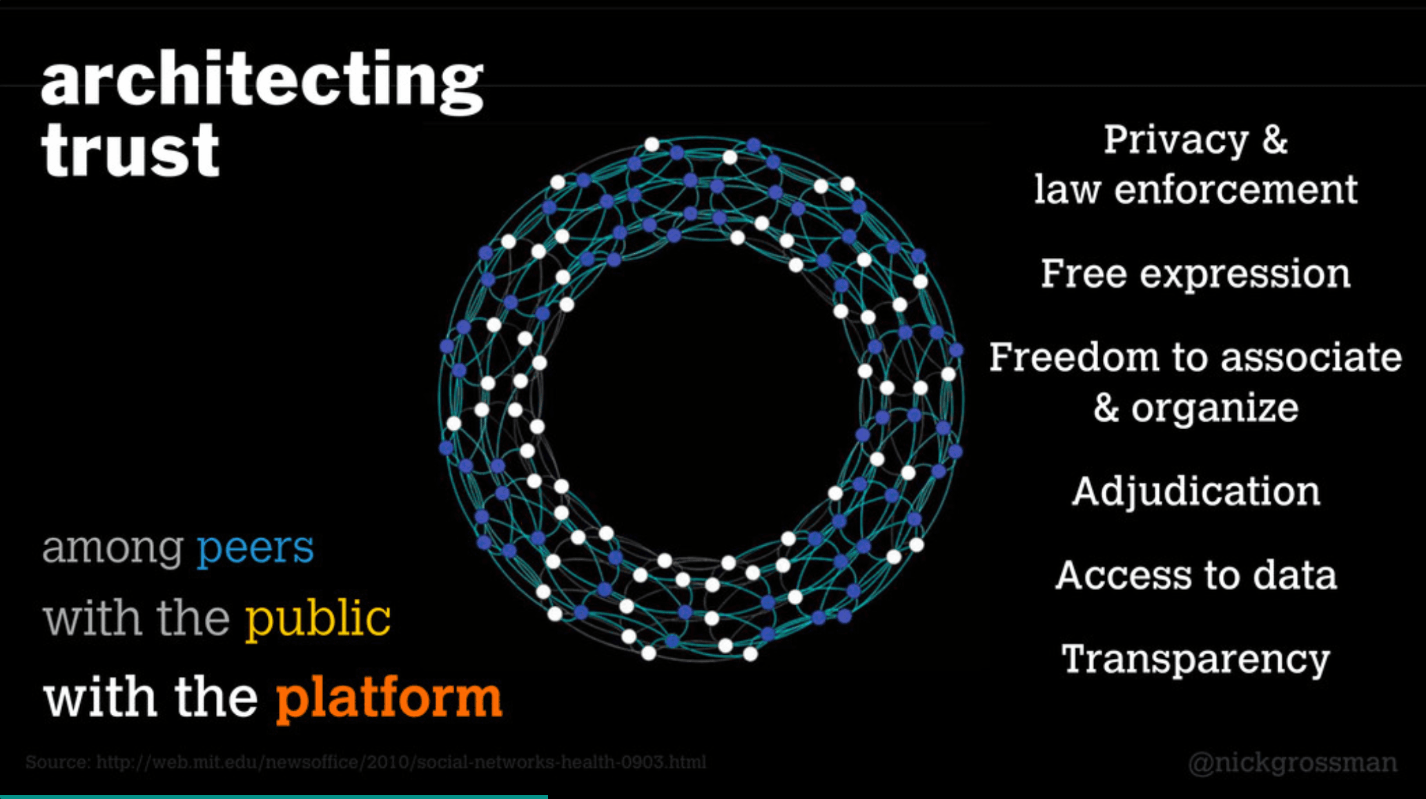 In terms of network & community governance, platforms establish policies that take into account issues like privacy, enforcement of rules (both public laws and network-level policies), freedom of expression and the freedom to associate & organize, and transparency & access to data (both regarding the policies and activities of the platform, and re: the data you produce as a participant in the community).